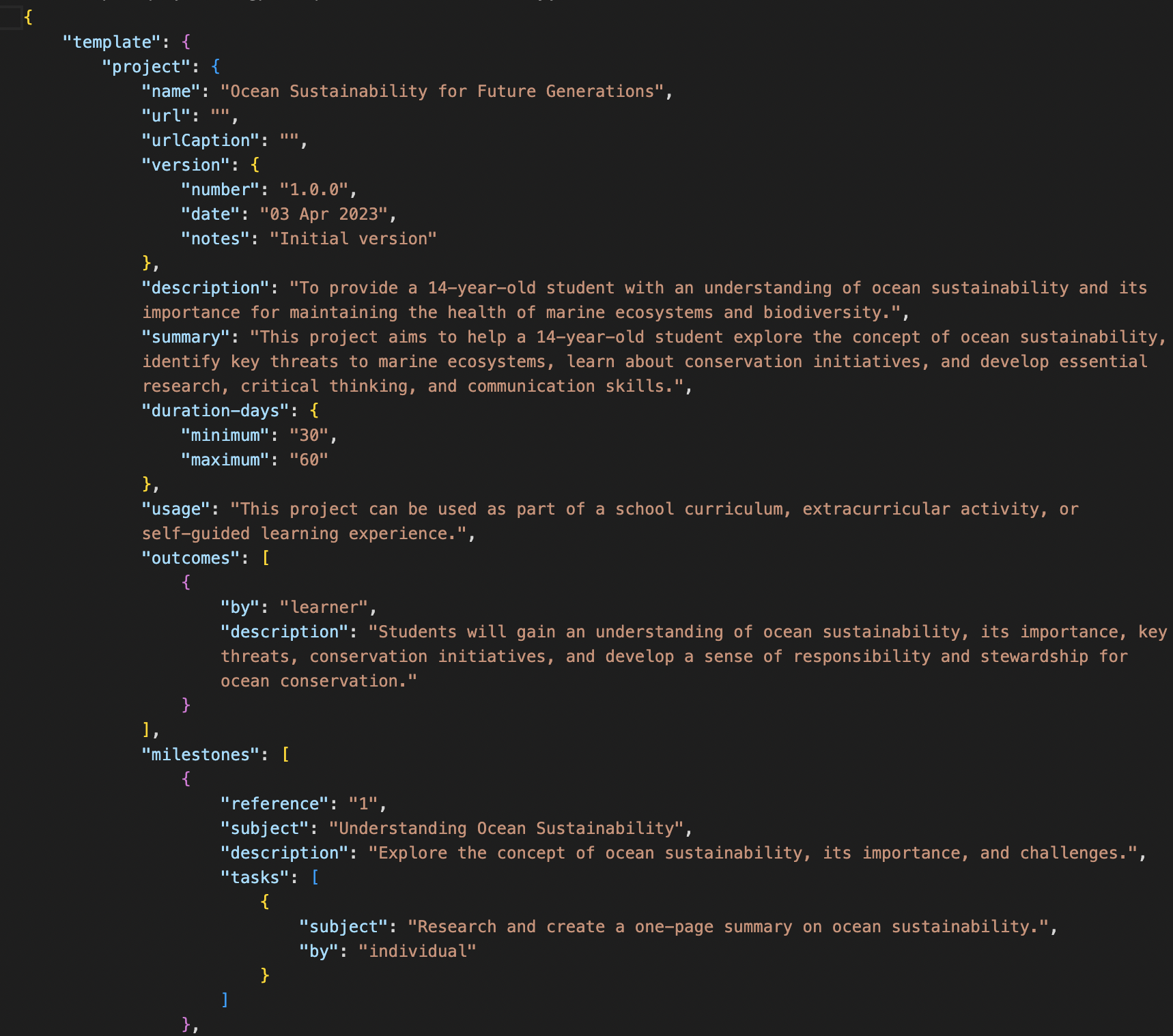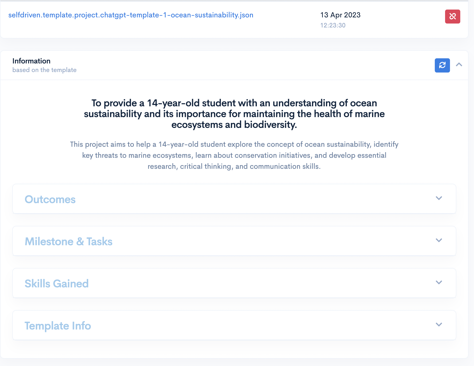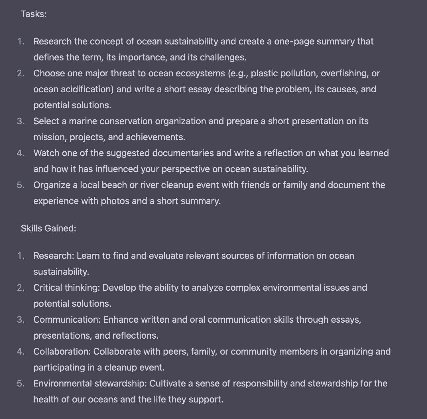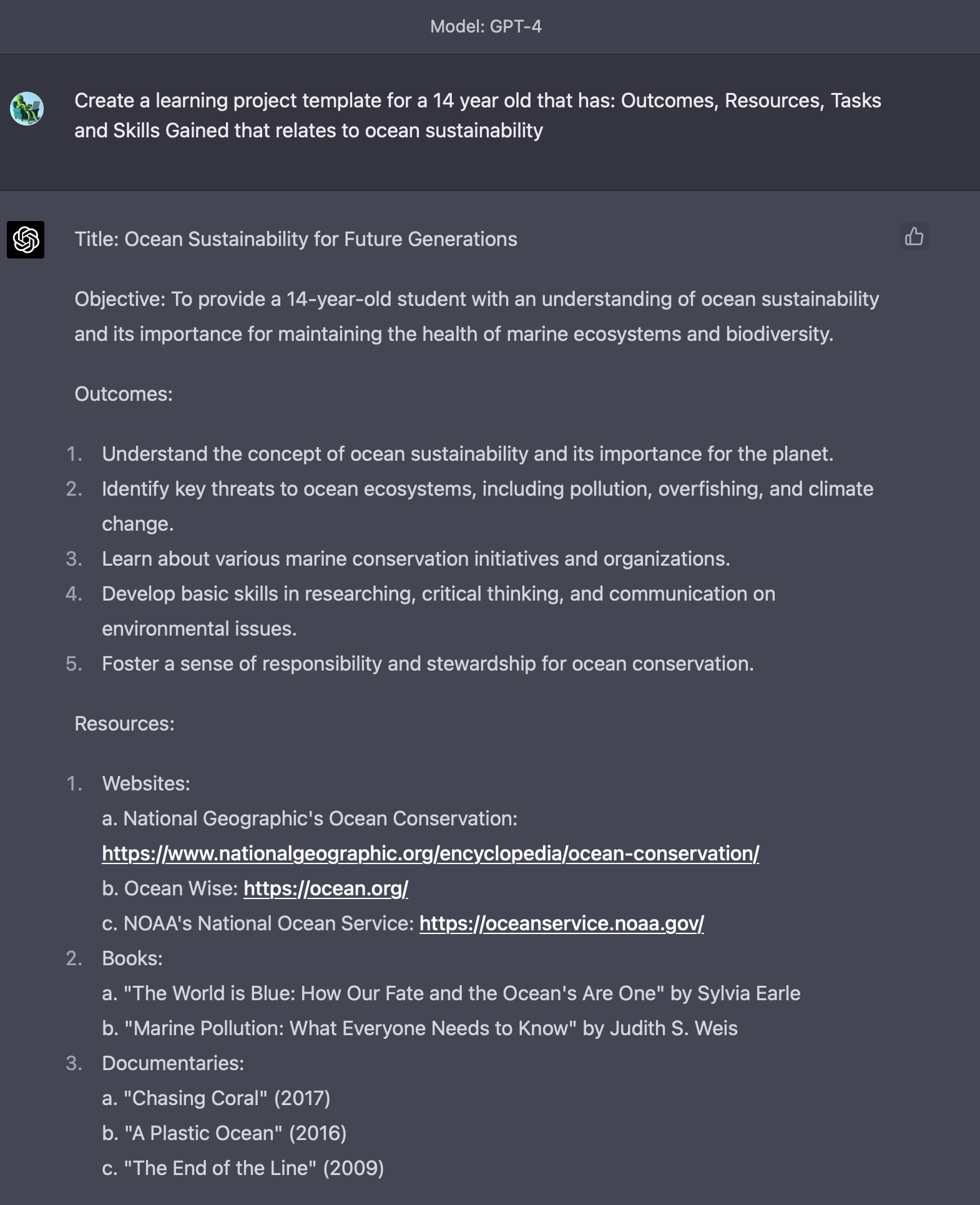 CA Prompt #1: "Create a learning project template for a 14 year old that has: Outcomes, Resources, Tasks and Skills Gained that relates to ocean sustainability"