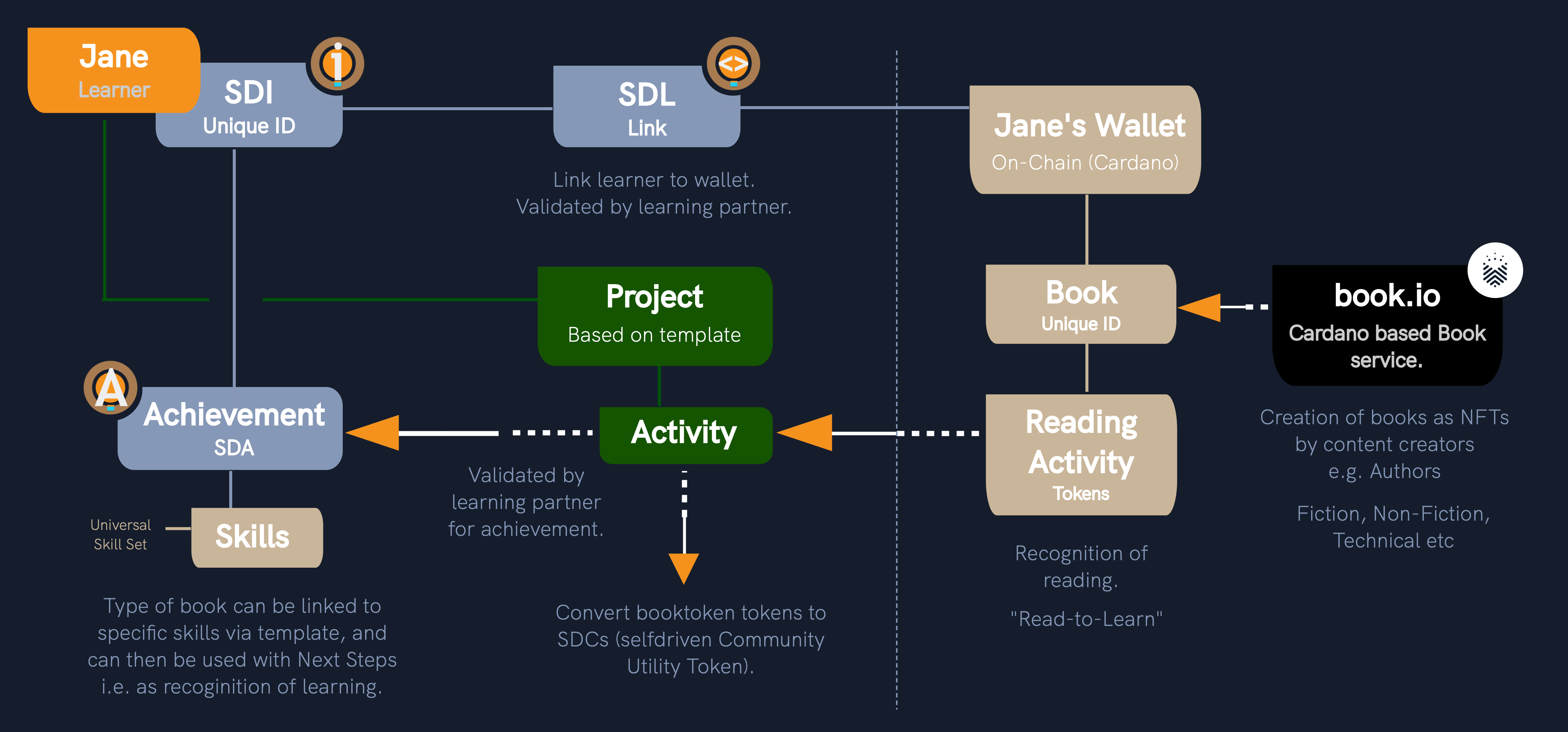 The following conceptual example shows how in the future, using book NFTs generated by the book.io service as an example, a learner's on-chain reading activity can be linked to on-chain selfdriven achievements e.g. SDA token.