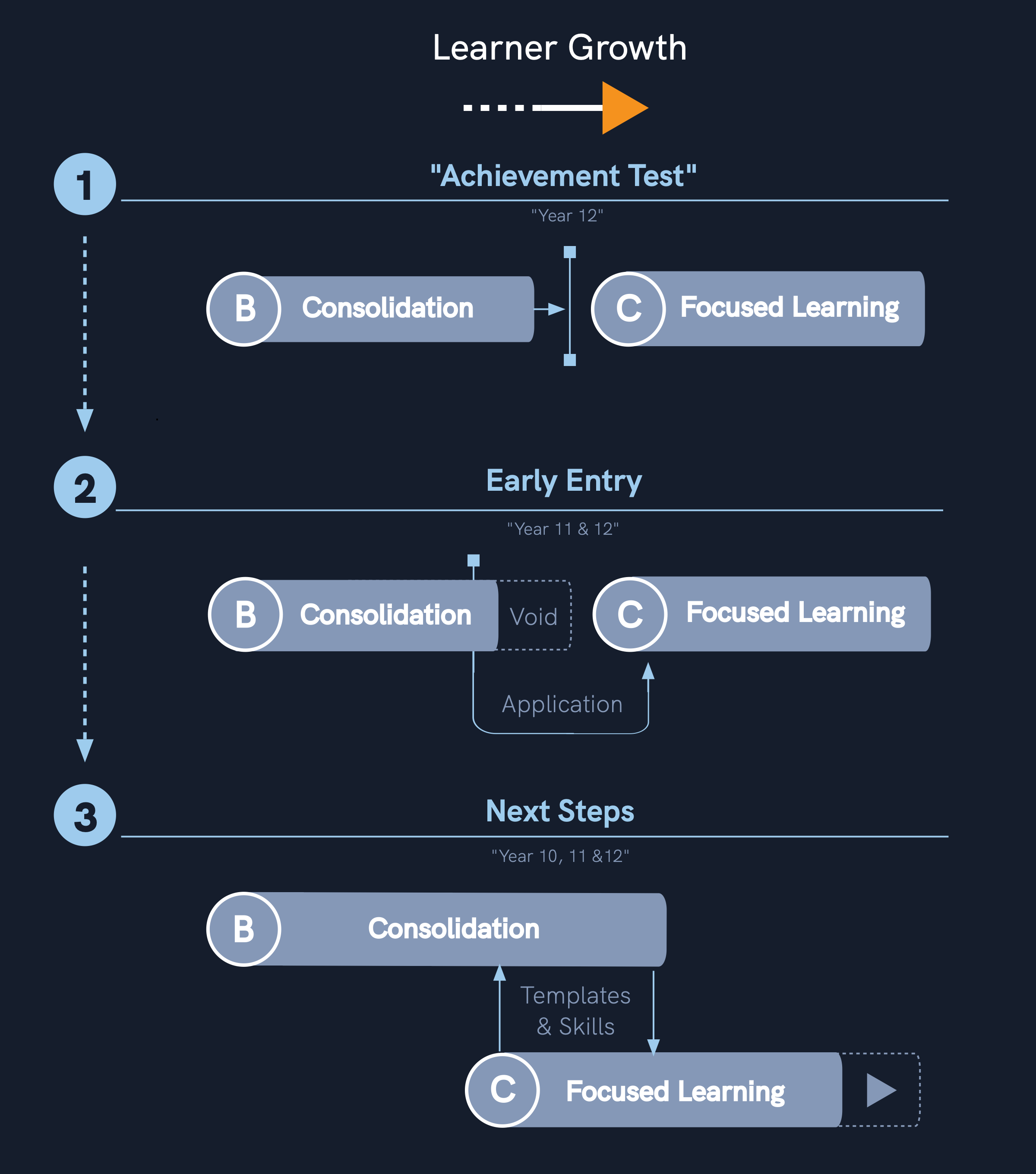 "A" an Introduction to Llearning, "B" Consolidation of Learning & "C" Focused Learning.